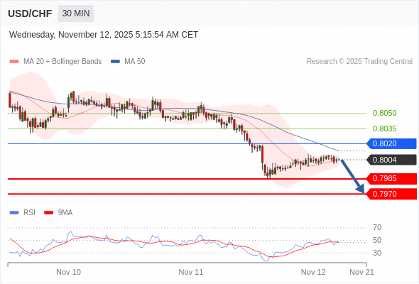 在 0.8020 之下,看跌,目标价位为 0.7985 ,然后为 0.7970 。