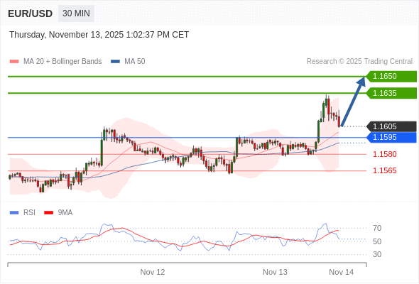 在 1.1595 之上,看涨,目标价位为 1.1635 ,然后为 1.1650 。