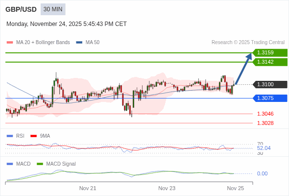 英镑/美元 当日内 : 看涨,当 1.3075 为支撑位,目标定在1.3159。