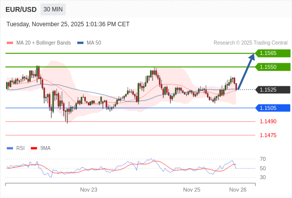 在 1.1505 之上,看涨,目标价位为 1.1550 ,然后为 1.1565 。