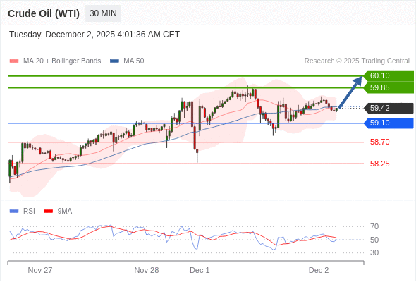 在 59.10 之上,看涨,目标价位为 59.85 ,然后为 60.10 。