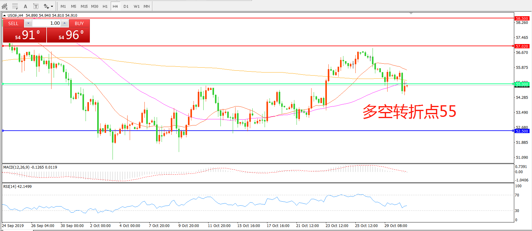 4小时图看,油价呈现震荡下行走势,200周期均线附近再次成为多空争夺焦点,均线系统走平,MACD红柱减少,RSI指标走平,日内重点关注55美元一线得失。