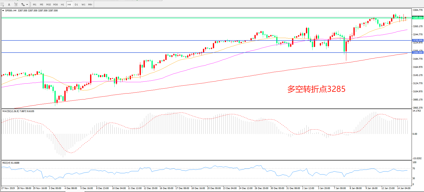 4小时图看,标普500维持高位整理,围绕21周期均线附近进行博弈,均线系统走平,MACD红柱增加,RSI指标走平,日内延续震荡概率较大。