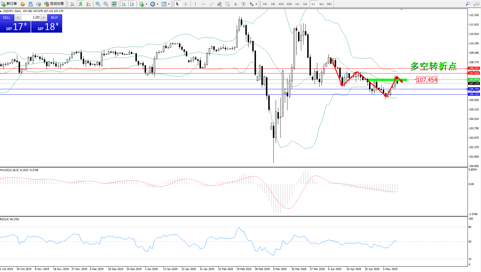 美元兑日元下跌0.48%107.14,盘中低点为107.12;美元指数大幅回落,美国4月核心CPI环比下跌0.4%,为有史以来最大月跌幅,因全球投资者继续担心新型冠状病毒疫情可能卷土重来,这令美股股指期货走低,而避险日元重获追捧。但眼下市场情绪依然敏感多变,这也令作为风险情绪首要信号的美元兑日元汇价面临更大程度的波动前景,短期内上方60日均线切入位108.40仍将提供巨大压制力,但下行空间亦在107心理关口上方受限。