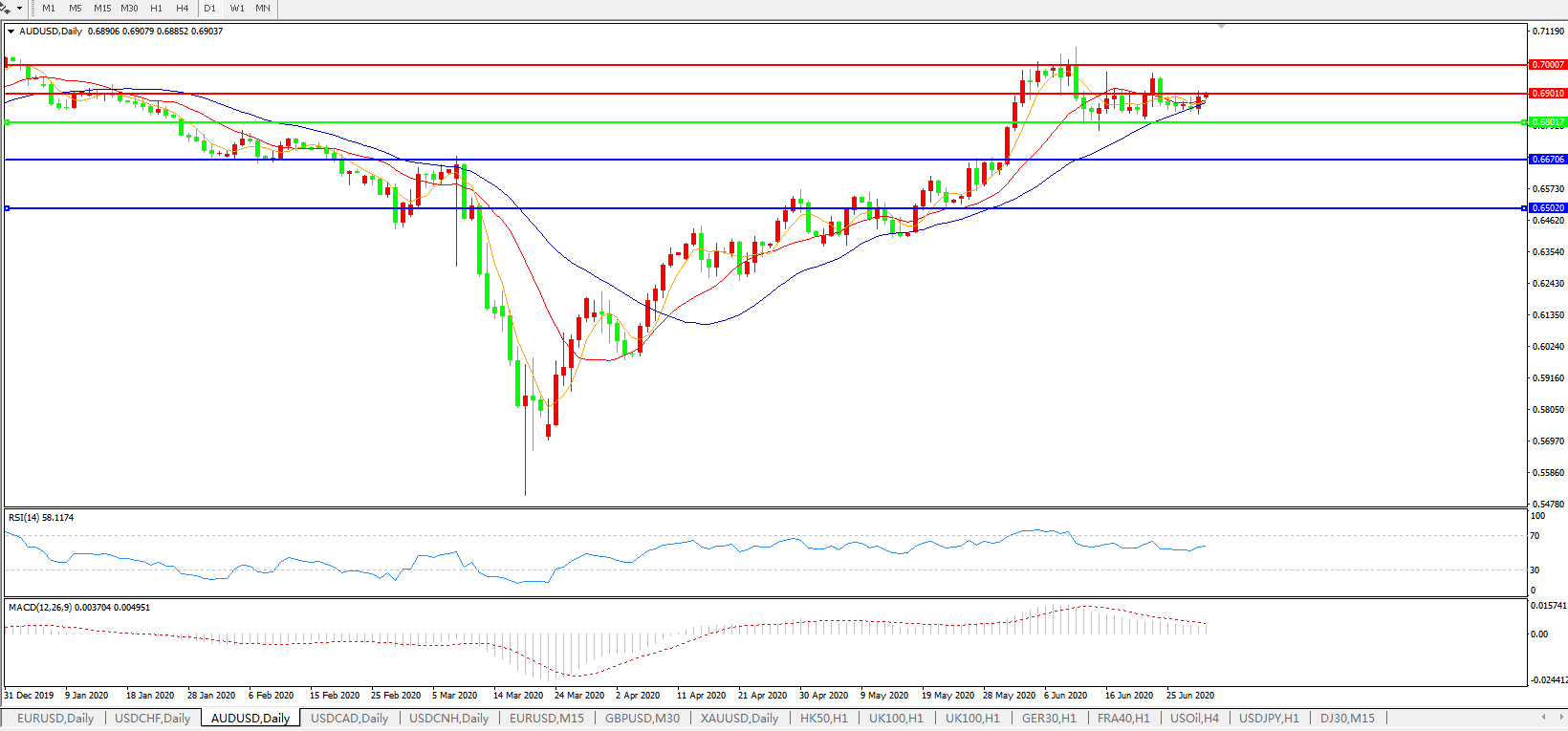 技术面简析:日图短期均线高位粘合走,汇价窄幅整理略显强势,MACD运行于0轴上方且量能持续缩量,RSI有走升迹象,预计汇价短线大概率将继续整理,关注0.6800关口支撑。