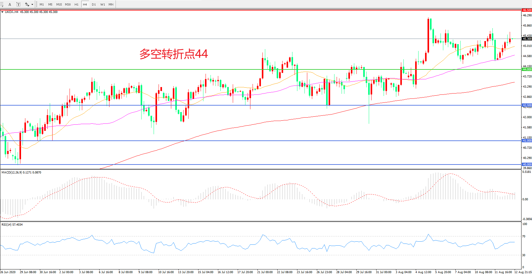 4小时图看,油价冲高回落后延续高位震荡,55周期均线成为短期支撑,46.5成为上方阻力,短期均线走平,MACD红柱减少,RSI指标走平,日内延续震荡概率较大。
