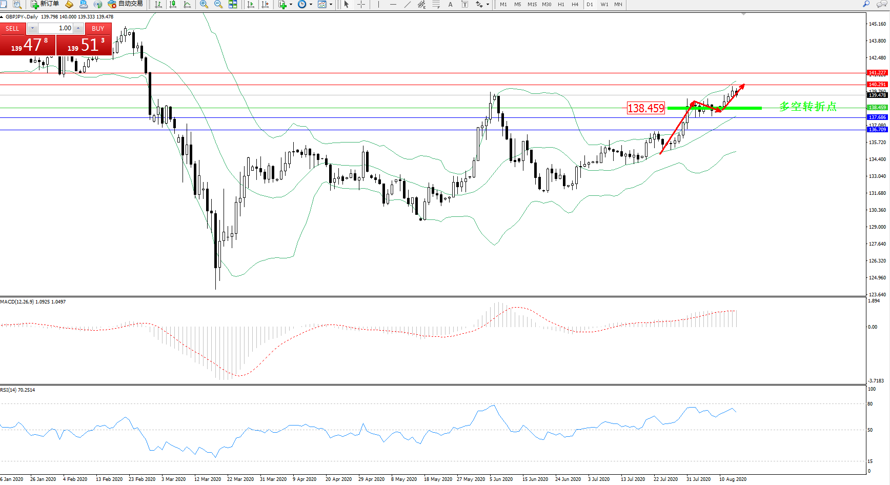 英镑兑日圆高位维持139.470附近弱势整理,日本第二季度季调后实际GDP年化季率将大幅萎缩27%,出现1955年以来最严重的萎缩;日本2020财年GDP料下滑5.6%,2021财年料增长3.7%;日本2020财年核心CPI料下降0.3%,2021年料上升0.2%,全球地缘及贸易争端对日本经济有负面影响。英国称与日本贸易谈判取得良好进展,希望很快达成协议。同时也仍对美国朝野的援助协议僵局感到担心。投资者担心,如果谈判继续无法达成妥协,将严重冲击美国未来消费者支出水平,进而引发经济衰退。