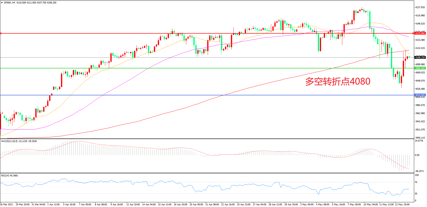 4小时图看,标普500探底回升,短期走势有所回暖,但200周期均线依然成为上方阻力,4080成为多起做支撑,MACD绿柱缩短,RSI指标走平,日内延续震荡概率较大。