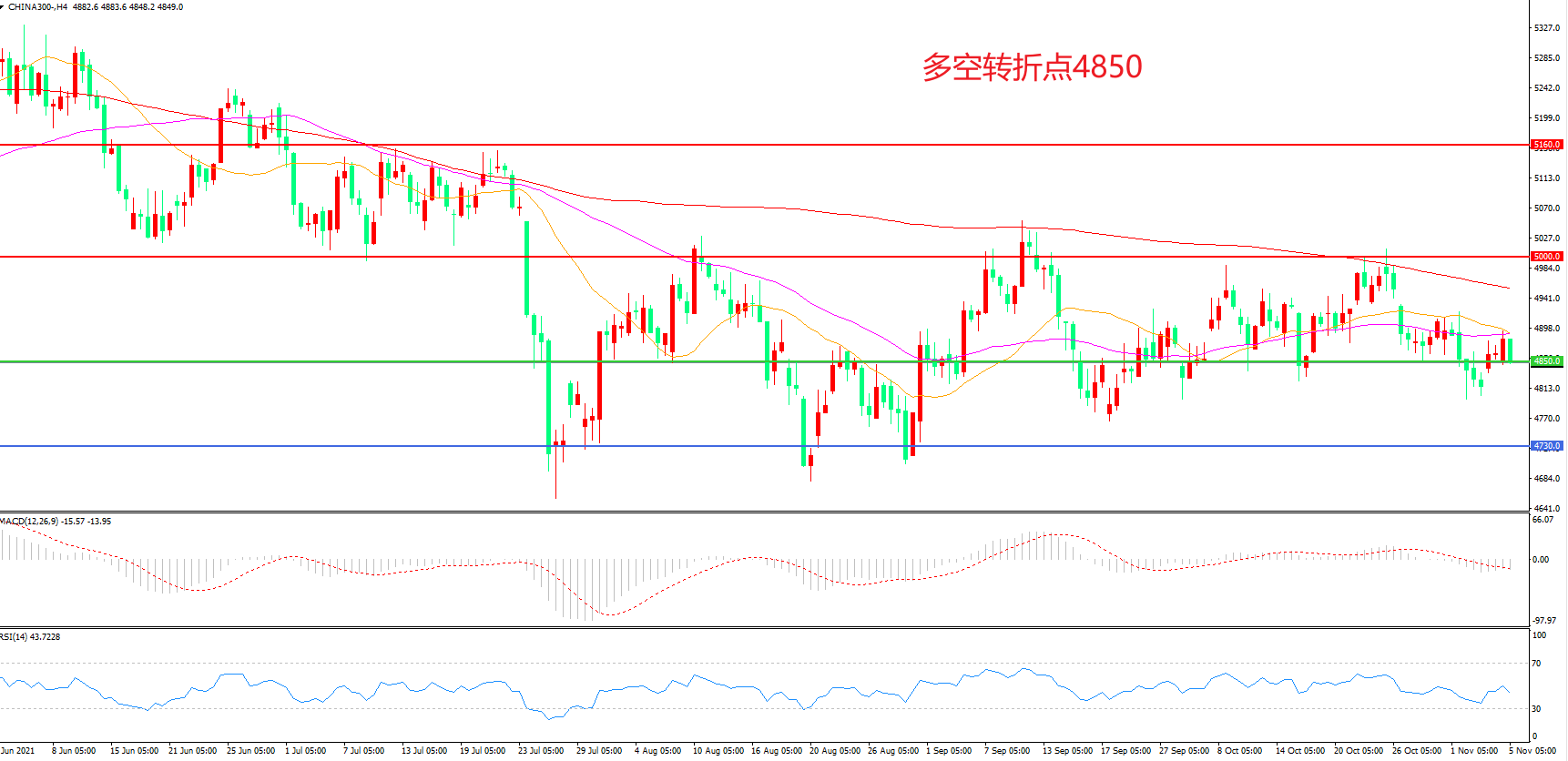 上周五(11月5日),A股三大指数集体收跌,其中沪指跌幅达到1%,权重蓝筹表现低迷,沪深300震荡回落,收报4850点,两市合计成交1.1万亿,北向资金全天净卖出近6亿。三季报公告过后题材类个股炒作开始抬头,沪指反弹缺乏成交量支持,接下来沪深300有望继续围绕着4850点的整数关口继续震荡和磨底,行情上呈现区间震荡特征。