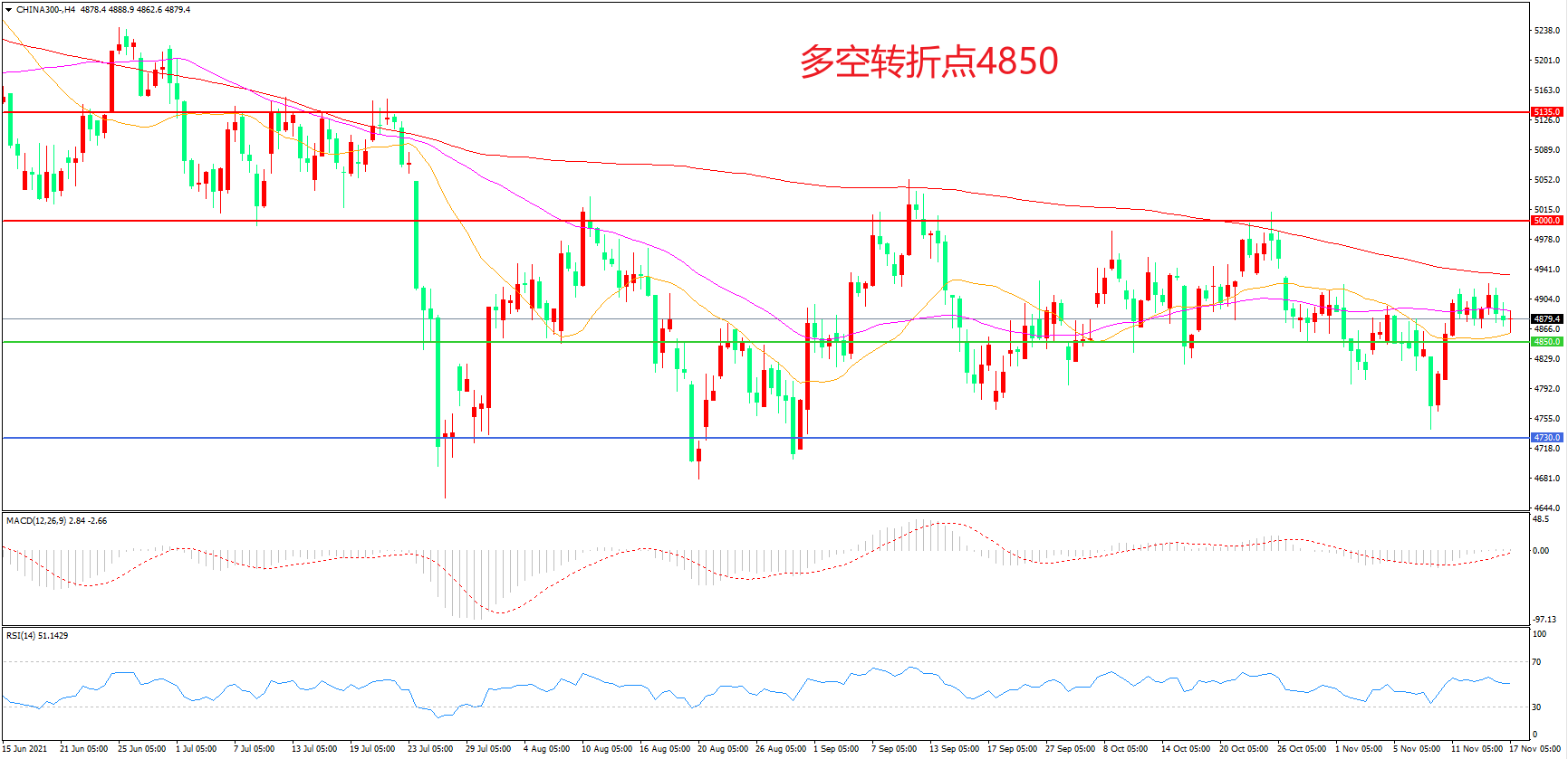 4小时图看,沪深300突破4850之后窄幅震荡,短期走势有所回暖,200均线成为上方阻力,4850成为多空分水岭,MACD红柱增加,RSI指标走平,日内延续震荡概率较大。