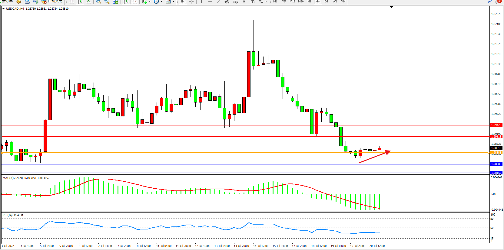 美元加元USDCAD——4小时K线图显示: