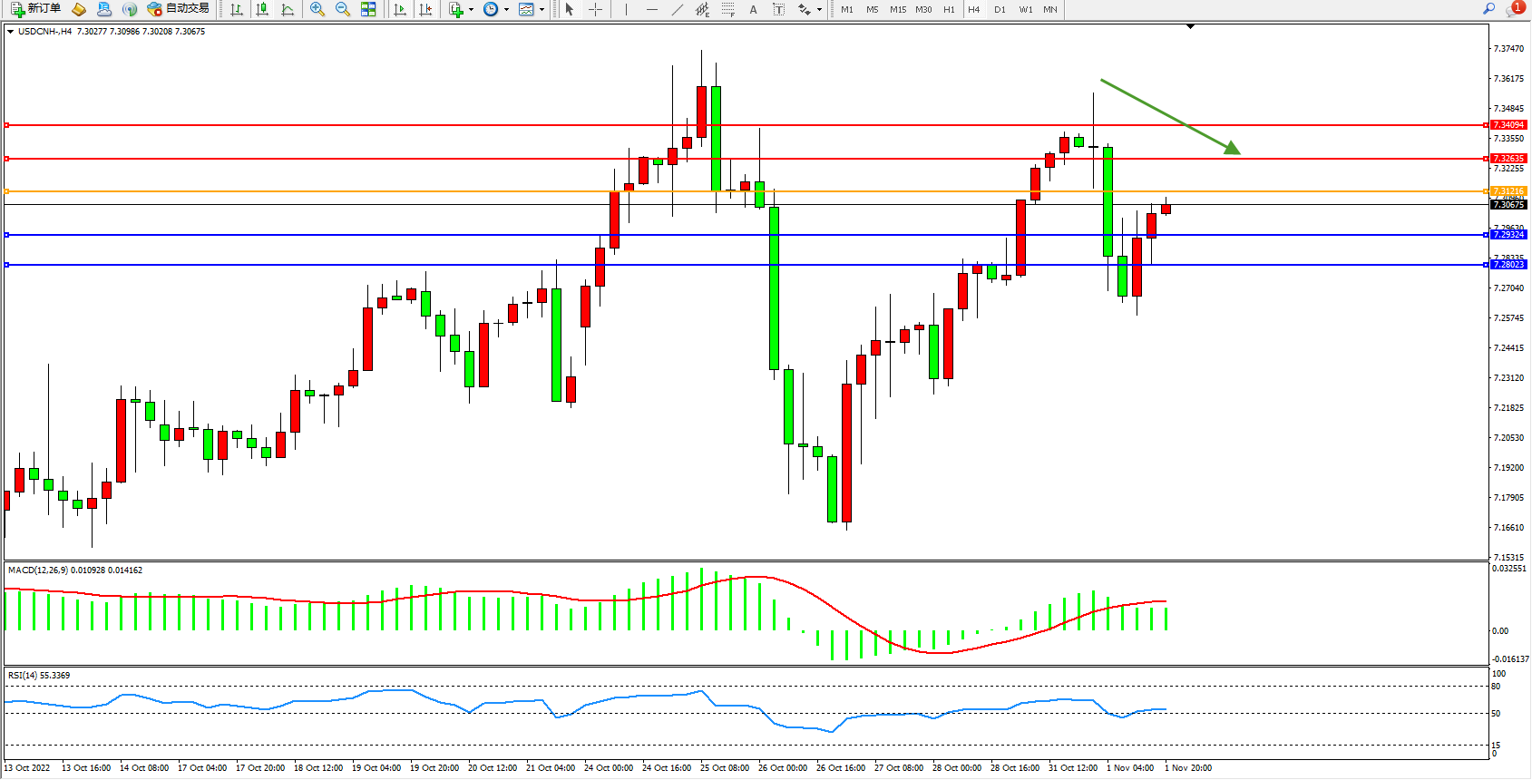 美元人民币USDCNH——4小时K线图显示: