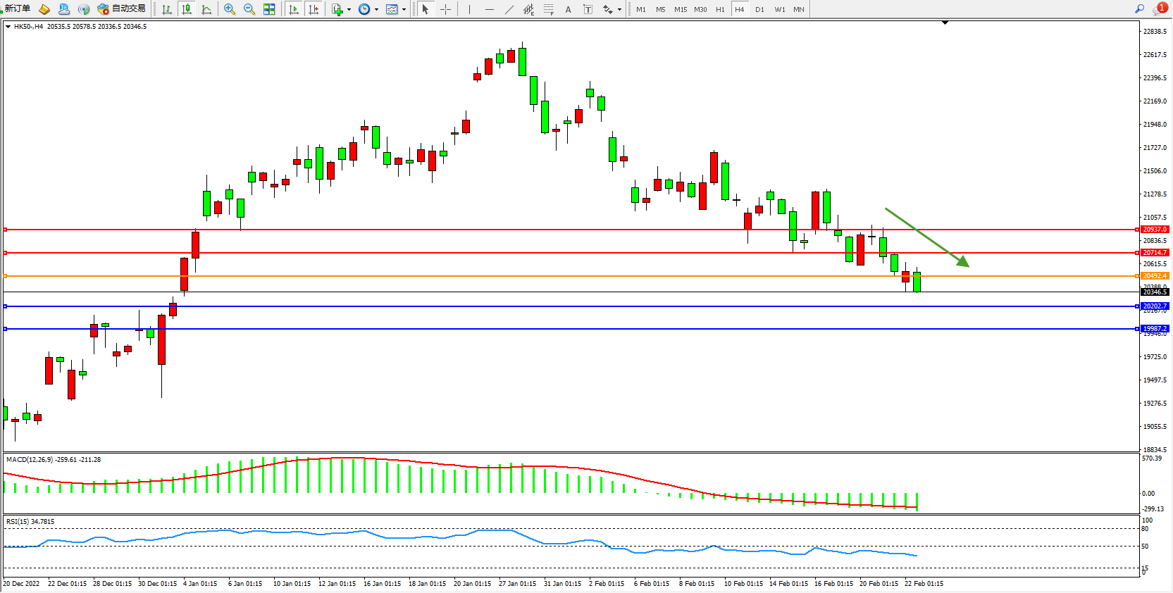香港恒生指数2月22日(周三)收盘下跌105.65点,跌幅0.51%,报20423.84点;港股继续下跌,盘中因香港推出2023年财政预算案出现短暂拉升,恒生科技指数最终下跌1.38%,恒指、国指分别下跌0.51%和1.35%,三者再度刷新调整低价。大型科技股多数下跌,京东跌3%,南下资金逆势净流入27.09亿港元,大市成交额为1146亿港元。香港《2023-24财政预算案》今日正式发布,政府重磅透露会引入新的“资本投资者入境计划”,将一定金额的资产投放在香港市场,即可申请来港居住及发展,但不包括物业投资。