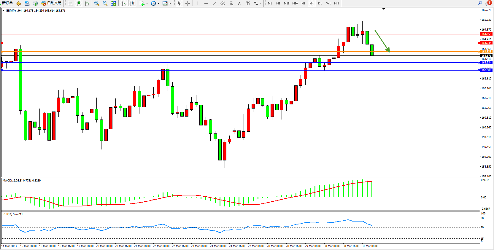 4小时图看:多头动力持续震荡上扬后高位遇阻回撤,市场空头情绪开始伺机入场向下移动,短期跌势或将延续,MACD指标处于多头区域高位徘徊,RSI指标处于多头区域整理下移;