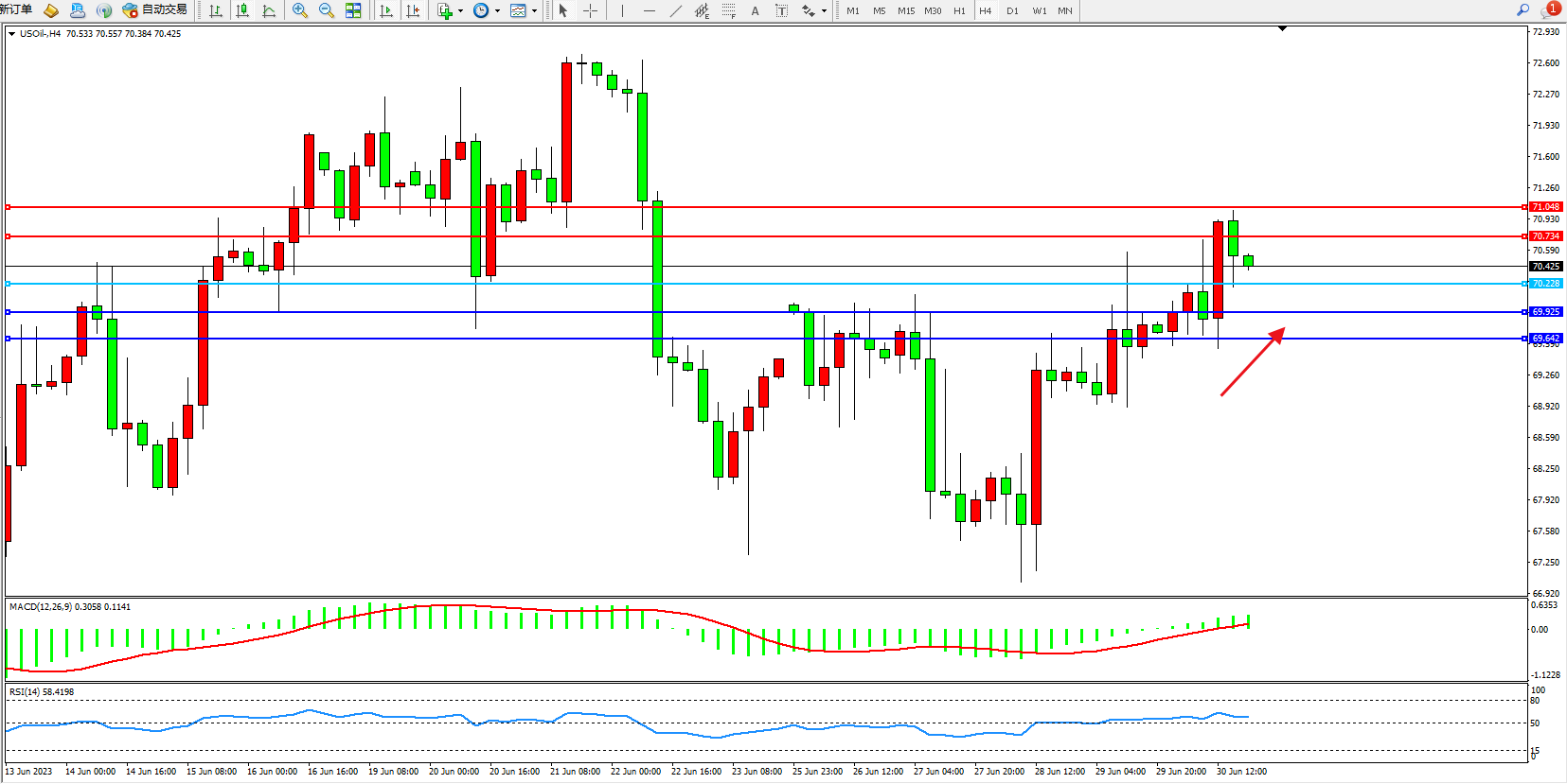 原油维持70.425附近震荡,欧佩克+或沙特阿拉伯的减产将导致2023年下半年出现大幅度的原油供应缺口。